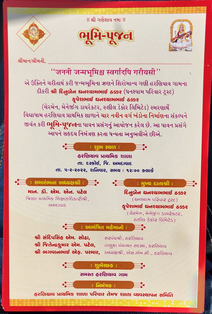 Under the Name of Ghanshay Pariwar Trust, we (Rushil Decor Limited) initiated the work of Extending four new classes in Hariniyan primary school, Dascroi, Ahmedabad.